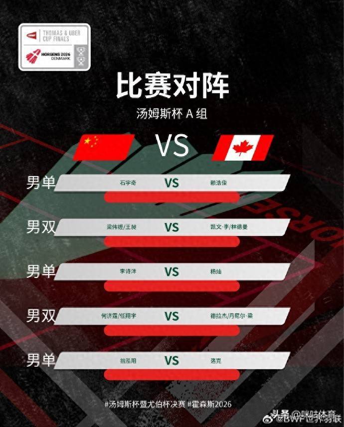 2026年汤姆斯杯小组赛A组第二场,中国队将对阵加拿大队,两边出场威望如故公布,比赛将于北京技巧今天14:30分启动。